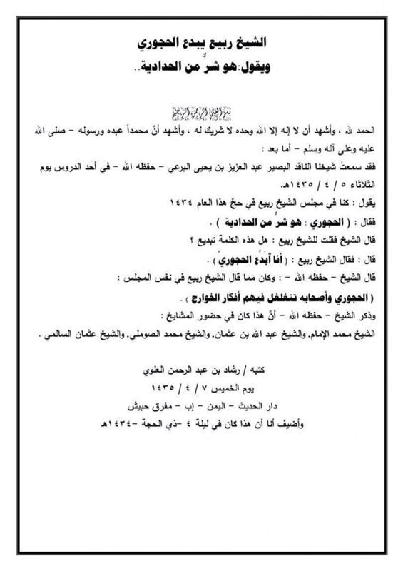 Shejkhu (Bura’i) – Allahu e ruajttë – tha: Ndër të tjera, Shejkh Rabij tha në të njëjtin mexhlis: “Tek Haxhuri dhe pasuesit e tij kanë depërtuar ideologjitë e Khauarixhëve”